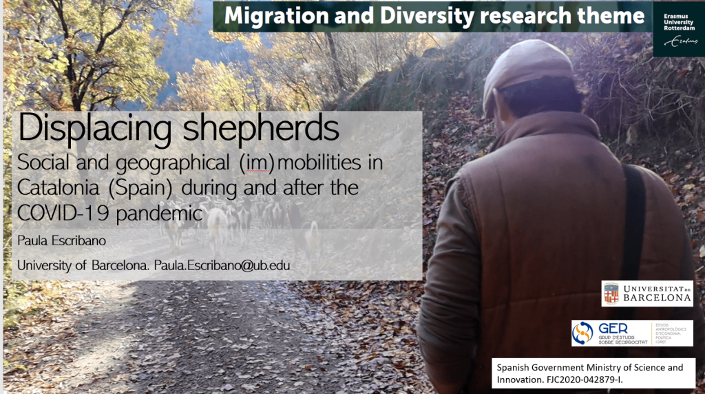 24 de octubre de 2023, 12h Aula 3.39 Conferencia Invitada: “Displacing shepherds: social and geographical (im)mobilities in Catalonia (Spain) during and after the COVID-19 pandemic” en el Seminario de Migración y Diversidad del Instituto de Ciencias Sociales de La Haya, Países Bajos. Conferencia realizada en el marco de la estancia con el Grupo de Ecología Política del Instituto de Ciencias Sociales de la Erasmus University of Rotterdam.